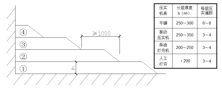 c、长宽比较大时,回填长度每15m为一段,每层接缝处应制作成阶梯形,碾迹重叠0.5~1.0m,上下层错缝距离不应小于1m。
