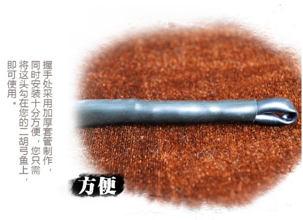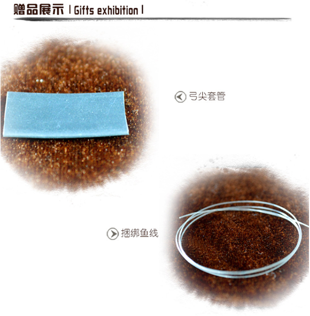 2、然后将弓尖-头穿入弓杆小孔,弓尖马尾不用打结,用配送的鱼线缠绕数圈绑上即可,绑线前在弓尖的杆与马尾间放一点松香粉,再绑紧扎线,绑好后再滴两滴502胶水,这样就比较牢固了。
