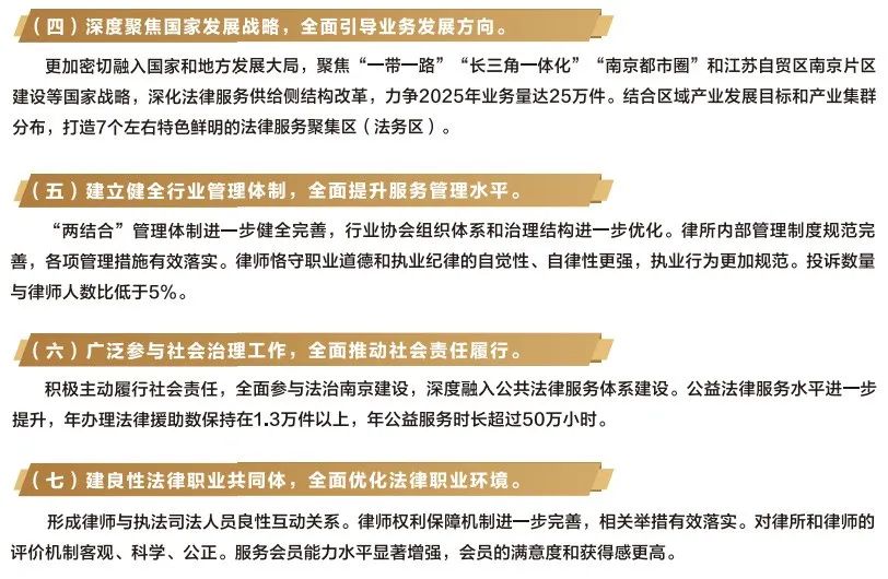 推动南京律师行业高质量发展走在前列,实现从“律师大市”到“律师强市”的跨越,更加有效服务保障经济社会发展,满足人民群众法治需求。