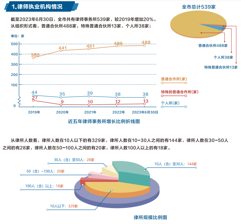 截止2023年6月30日,南京市共有律师事务所539家,较2019年增加20%。其中普通合伙所488家,特殊普通合伙所13家,个人所38家。