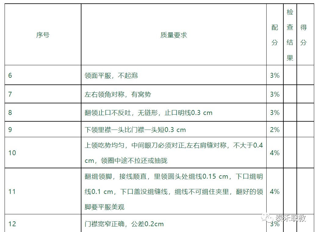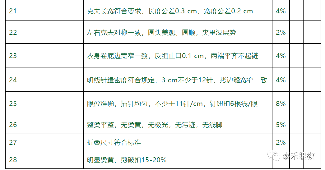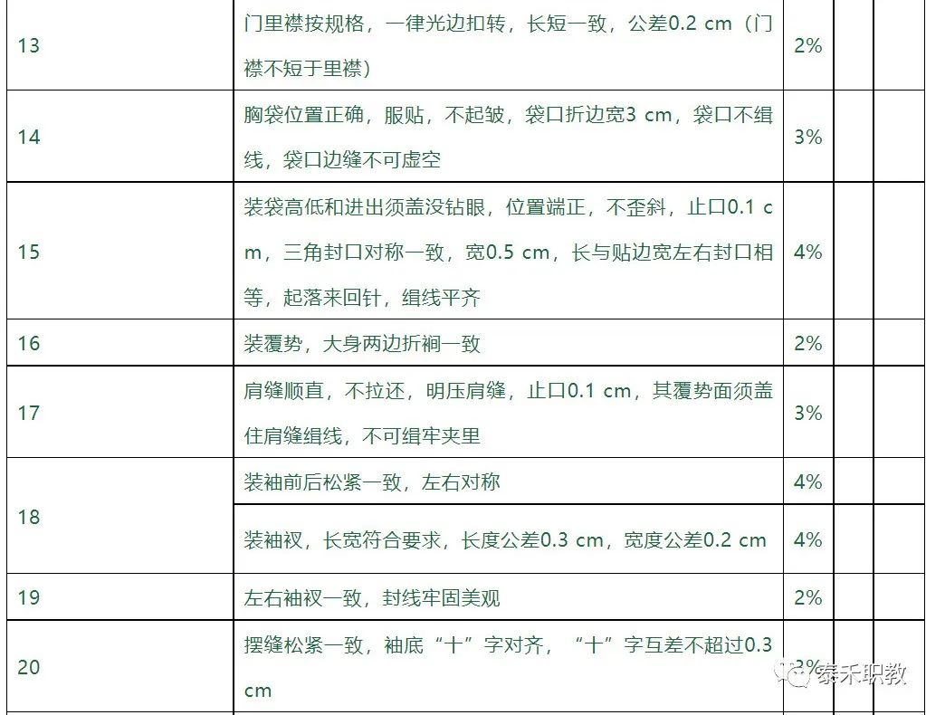 (7)锁眼每厘米11-15针,纽扣每孔不低于6根线。