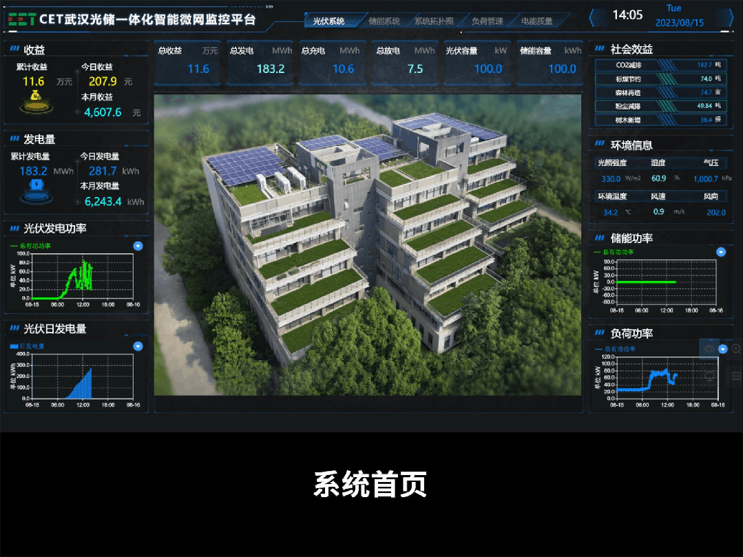 采用源网荷储深度协同核心理念,可全方位展示整个光伏电站的运行情况,包含市电供电、光伏发电、储能充放电、充电桩运行、负荷用电及光伏电站运行节能减排等信息。