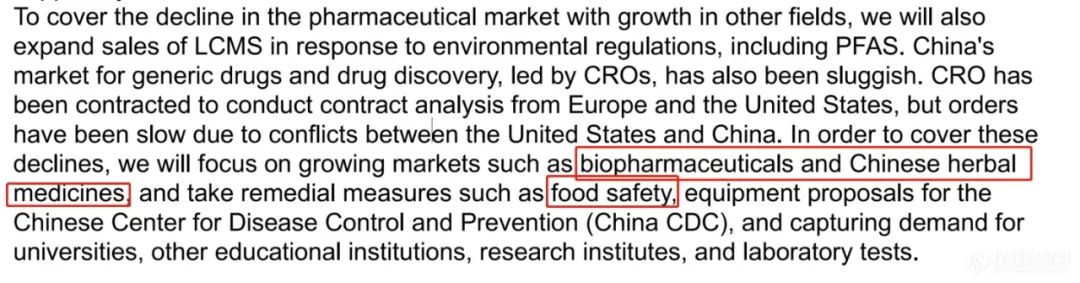 不仅如此,中国的仿制药和药物发现市场也疲软,由于中美贸易战的持续影响,CRO从欧洲和美国获得的分析合同订单放缓。为了弥补这些下降,岛津将关注生物制药、中药以及食品安全等增长市场,获取对高校、科研院所以及第三方分析测试机构的需求。