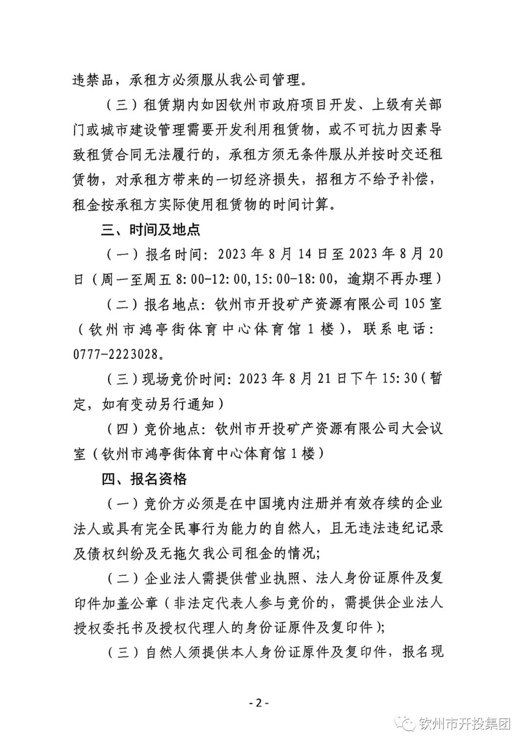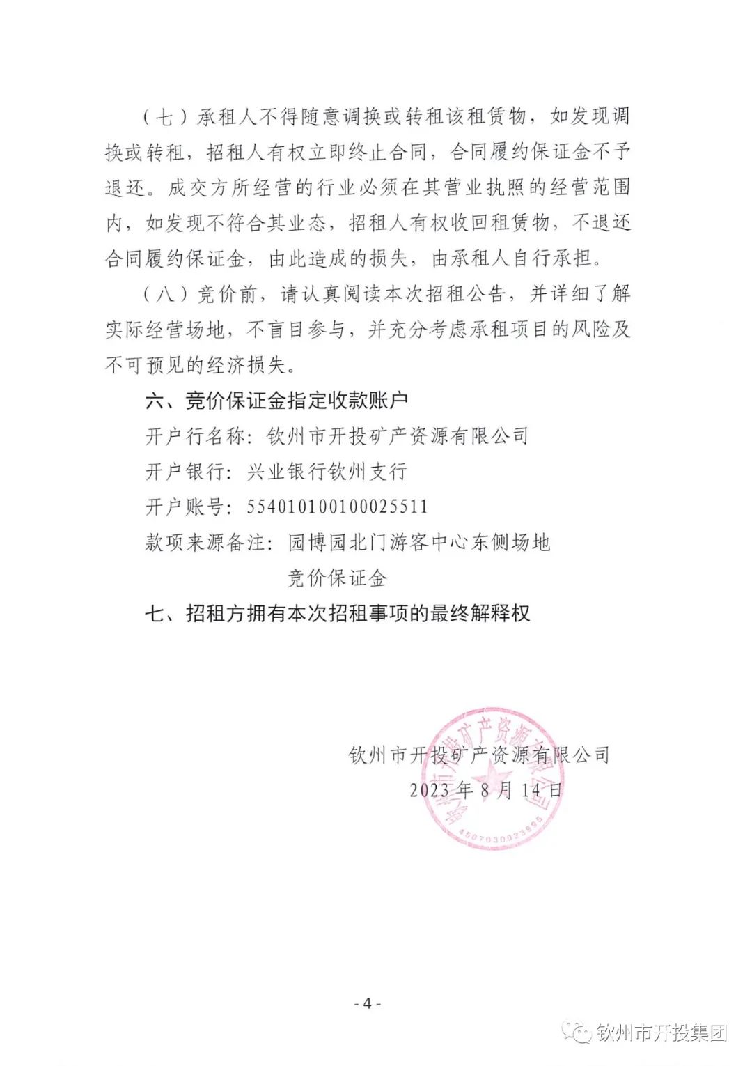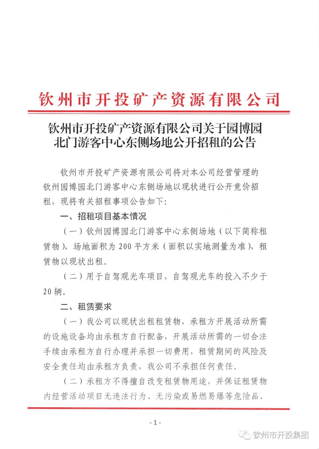 钦州市开投矿产资源有限公司关于园博园北门游客中心东侧场地公开招租的公告