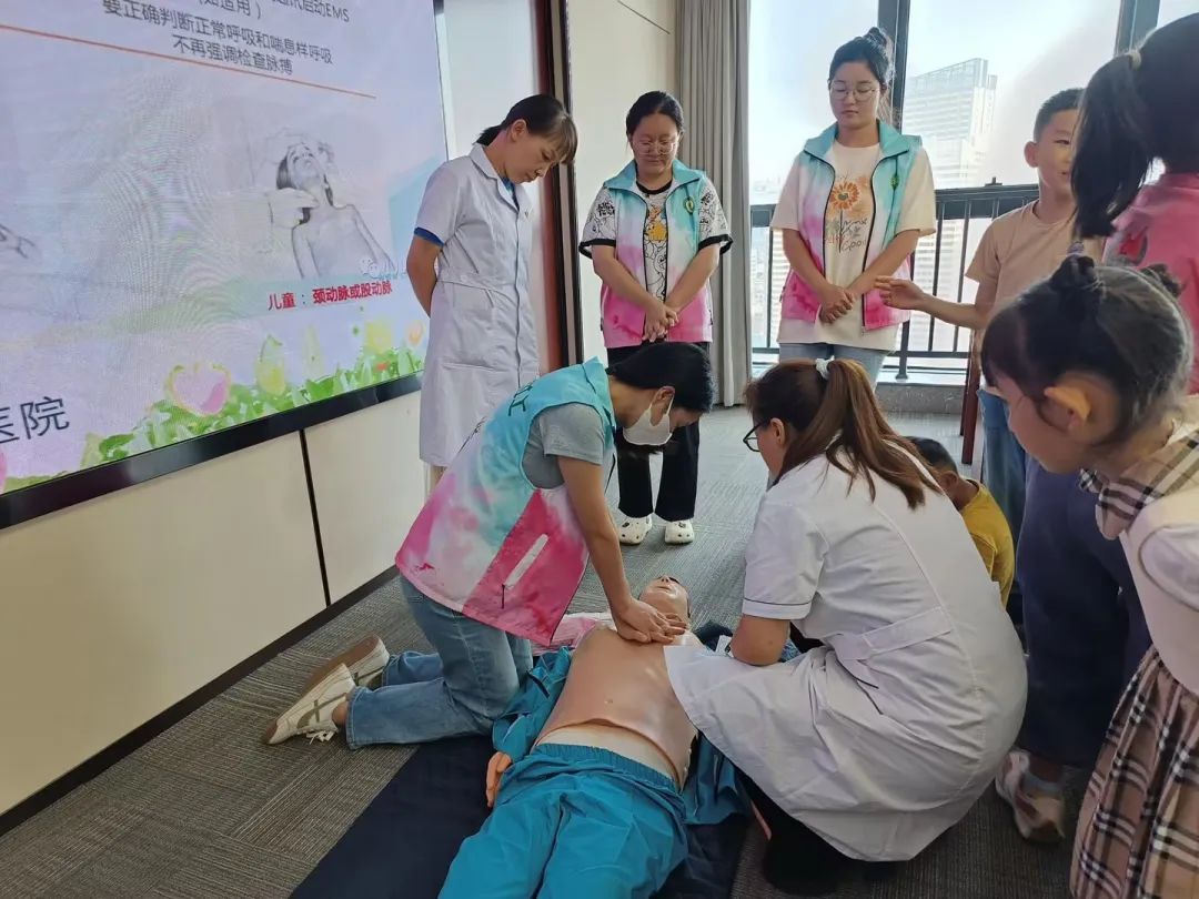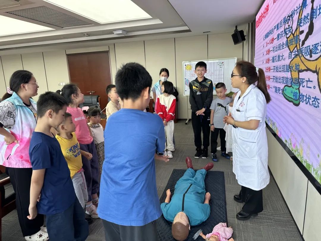 8月11日,冶金医院医护人员一行应邀到中铜大厦为机关工会假期托管班老师和儿童开展应急救护知识培训,普及应急救护技能。