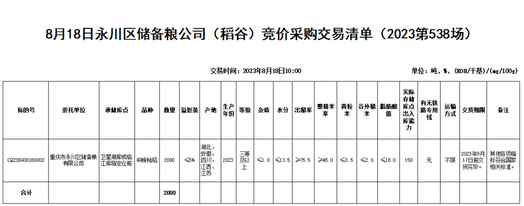 受重庆市永川区储备粮有限公司委托,重庆市粮油批发市场有限责任公司(即国家粮食重庆交易中心,以下简称“批发市场”)定于2023年8月18日10:00举办永川区储备粮公司(稻谷)竞价采购交易会,现将有关事项公告如下:
