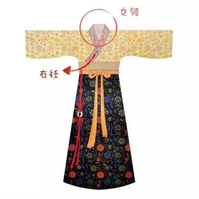 汉服的领型最典型的是“交领右衽”,就是衣领直接与衣襟相连,衣襟在胸前相交叉,左侧的衣襟压住右侧的衣襟,在外观上表现为“y”字形,形成整体服装向右倾斜的效果。衽,本义衣襟。左前襟掩向右腋系带,将右襟掩覆于内,称右衽,反之称左衽。这就是汉服在历代变革款式上一直保持不变的“交领右衽”传统,也和和中国历来的“以右为尊”的思想密不可分,这些特点都明显有别于其他民族的服饰。