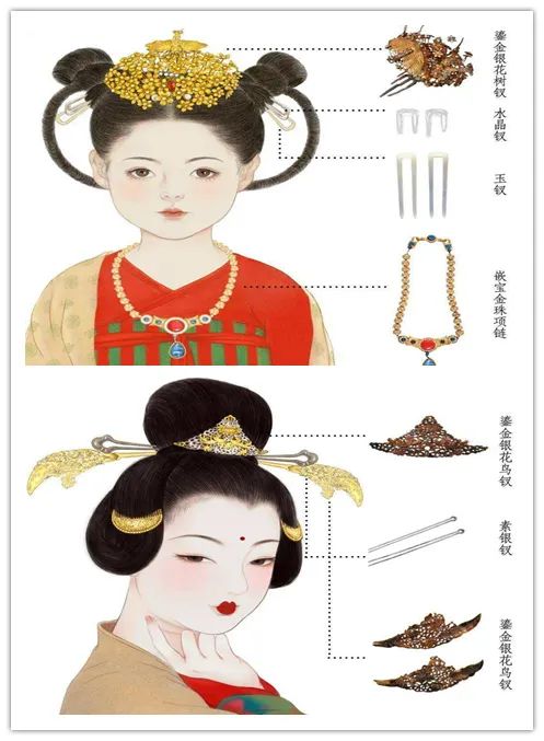 女子的首服主要由副、编次。发髻可梳成各种式样,并在发髻上佩带珠花、步摇等各种饰物。鬓发两侧饰博鬓,也有戴帷帽、盖头的。汉族妇女有八大首饰之称,分别为簪、栉[zhì]、钗、华胜、步摇、金钿、珠花、勒子(额帕)。狄髻是八大首饰的金银组合饰品。其中宋元时期除了发髻等饰物外,有一个极为突出的特点即戴冠 。头插梳篦自汉代即有记载。南朝妇女就爱在髻上插饰梳栉。唐朝妇女流行广插钗梳。北宋宫中妇女多在饰冠上安插白角长梳,後来传至民间,有高髻插梳之饰。宋词曰:髻鬟[jì huán]云样梳。明代女子盛装头上插满钗梳。汉族妇女还有戴绢花的习俗,所谓“宝髻簪花花”。