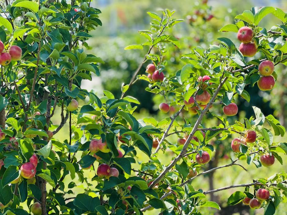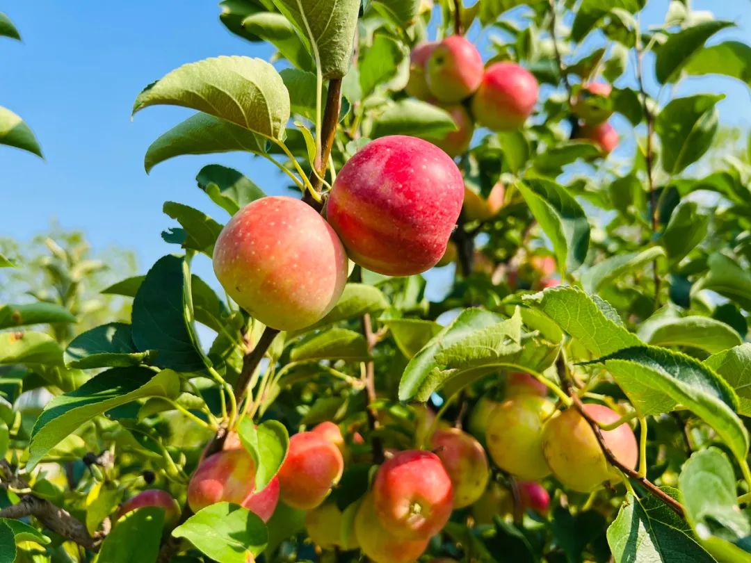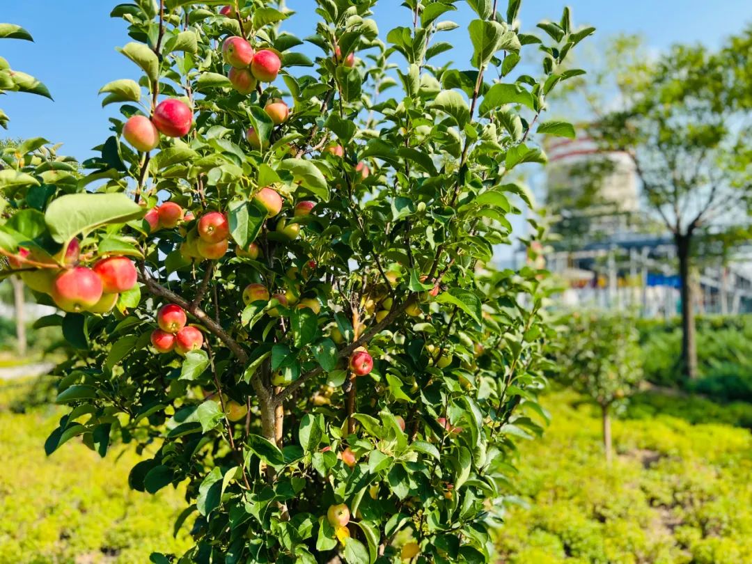 办公楼前的果树,挂满了一个个红灿灿的小苹果,像一盏盏红灯笼。熟透的苹果是红彤彤的,像小朋友害羞的小脸蛋。没有熟透的苹果是绿色的,上面还带有大小不一的小点,就像脸上的"雀斑”,闻一闻,一股淡淡的清香扑鼻而来。