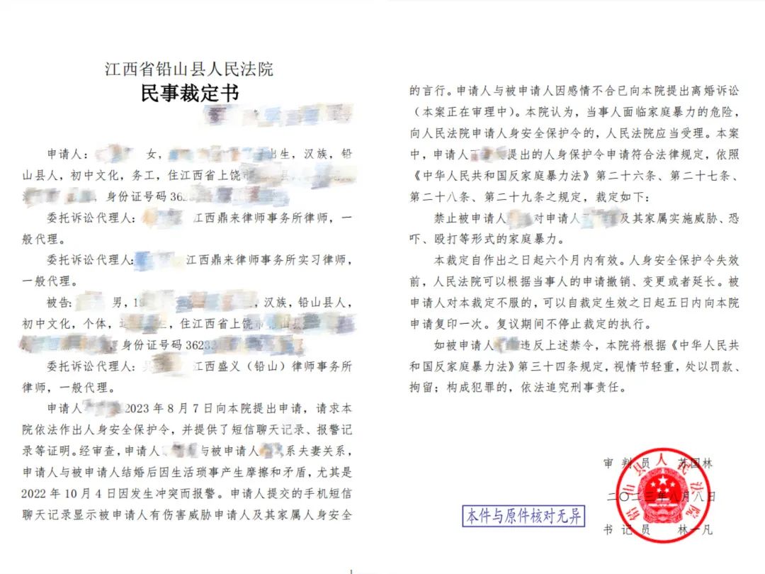 近日,铅山法院在审理一起离婚纠纷案件的过程中,依法以裁定书的形式发出本院人身安全保护令,为家暴受害者丁某某撑起法律“保护伞”。