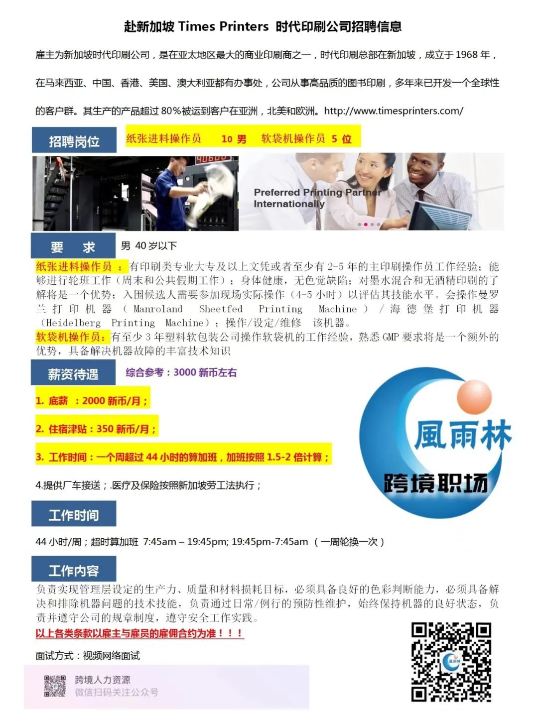 新加坡印刷公司招纸张进料操作员、软袋机操作员