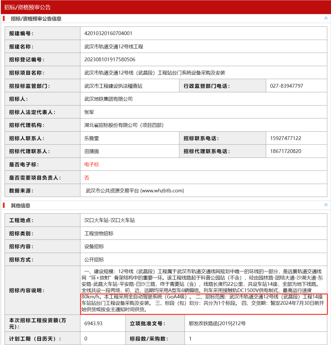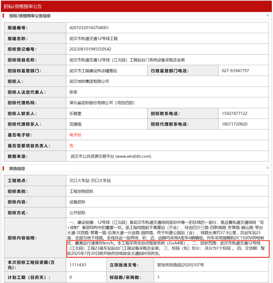 粉条获悉,最近在武汉招标网上出现了12号线的两个招标,分别为武昌段跟江北段,招标内容涉及站台门系统采购安装,其中,最引入注意的就是交货时间,分别为2024年7月,2025年7月。似乎还是对齐着最初的开通时间,武昌段2024年通车,江北段2025年通车。