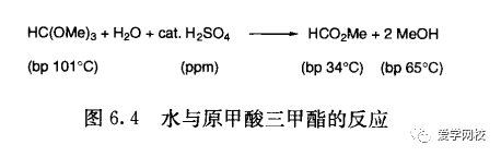 获得干燥溶剂的最简单途径是购买无水溶剂。查阅化学品目录就可以发现做小规模的反应时购买无水溶剂很方便,而购买大量用于放大反应时就比较昂贵了。最经济的方法是通过使水与溶剂形成共沸物来把水除掉,用分子筛除水可能适合与水不形成共沸物的溶剂。反应中还可以用原甲酸酯除水,因为其与水反应生成挥发性的副产物(图6.4)。这种处理方法只有在未反应的原甲酸三甲酯不影响后面的反应时才适用。用Na2SO,或者MgSO、干燥溶剂的效率是很低的,对于介电常数小于15的溶剂来说,在实验室规模,其中的水和其他杂质可以通过Al2O3 (经活化)或者SiO2 (经活化)过滤除去[8]。
