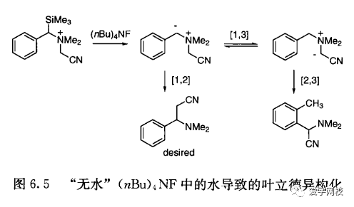水是一些稳定结晶化合物中固有的成分,既有有机物也有无机物。含结晶水的无机化合物有NaOAc●3H2O、 Fe (C2O4) ● 2H2O、Zn (OAc)2 ●2H2O、CaCl2●2H2O、SnCl2●2H2O、K2CO3●1.5H2O,从这些化合物中除去水并防止其再次吸水是不容易。人们发现“无水”(nBu);NF 其实含有1. 6当量的水,而且这些水可能导致不想要的两种叶立德的平衡(图6. 5)[910]。我们必须认识到这些化合物中水的存在,并进一步采取必要的措施来消除水的影响。水的存在并不总是不利的;水可能影响某些体系的活性和使用期,如甲基三氧化铼催化的环氧化反应(图1.5)。