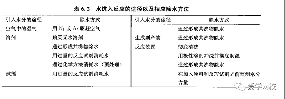 在一个反应中,水可以由空气、溶剂、试剂或者副产物引入,还可能作为杂质进人反应体系(表6.2)。因为水在各个反应过程中都可能作为杂质出现,所以要考虑其存在和影响。