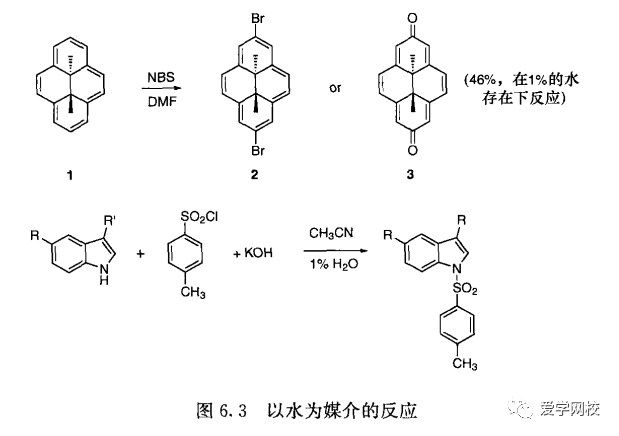 在某些情况下,溶剂中少量的水分就会改变原来的反应历程。轮烯1在无水DMF中溴代(图6.3)得到目标双溴代产物2;而在1%的水的存在下溴代却以46%的收率得到二酮[35]。但在乙腈中进行吲哚氮原子的甲苯磺酰基化时如果没有1%的水的存在,该反应就不能顺利进行(图6.3);显然少量的水对于溶解KOH是必要的[6]。这些例子说明了监测溶剂含水量的重要性,尤其因久置而吸收了空气中湿气的溶剂。