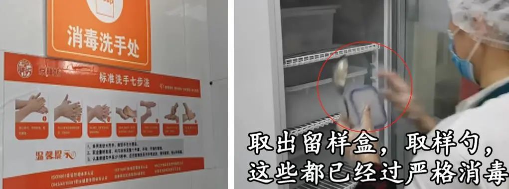 食品留样前,要求留样员按洗手流程进行洗手,佩戴好口罩,发网,一次性手套,用专用的取样勺子(镊子)进行取样。