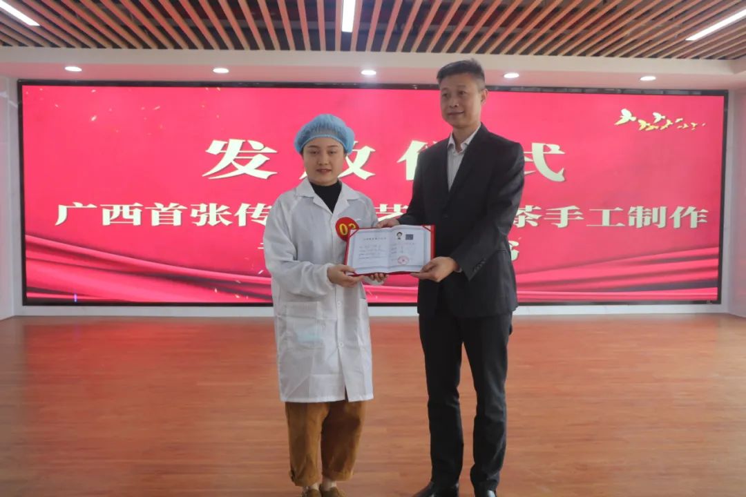 2023年4月28日,梧州市人社局副局长徐斌为来自苍梧县六堡镇的学员莫海沛颁发了全区首张传统工艺六堡茶手工制作专项能力证书,这标志着广西六堡茶技能人才培养由原来的“有技无证”变为“有证可考”,梧州摸索打造的这套“梧州方案”或将成为广西乃至全国六堡茶手工制作技能人才培养、考核的“标准样板”。