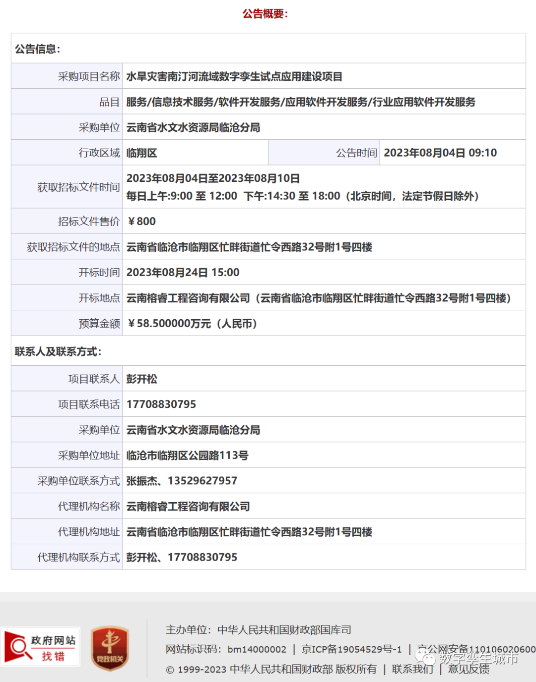 水旱灾害南汀河流域数字孪生试点应用建设项目 招标项目的潜在投标人应在云南省临沧市临翔区忙畔街道忙令西路32号附1号四楼获取招标文件,并于2023年08月24日 15点00分(北京时间)前递交投标文件。