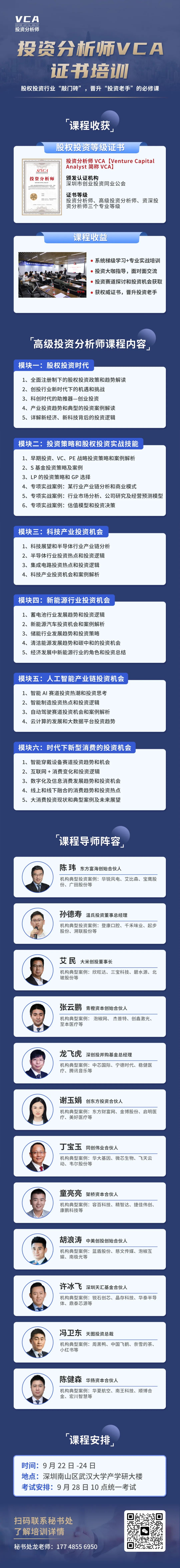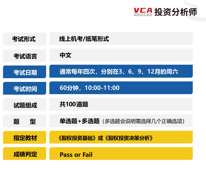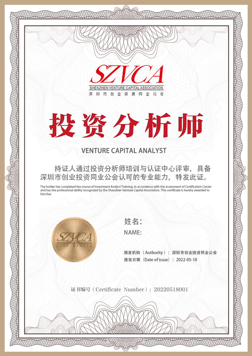 投资分析师专业等级证书(Venture Capital Analyst 简称:VCA)由深圳市创业投资同业公会颁发认证,是目前国内金融领域首个权威和实战的股权投资资格认证证书,面向创投、企业和相关专业人士的专业等级资格水平认证。