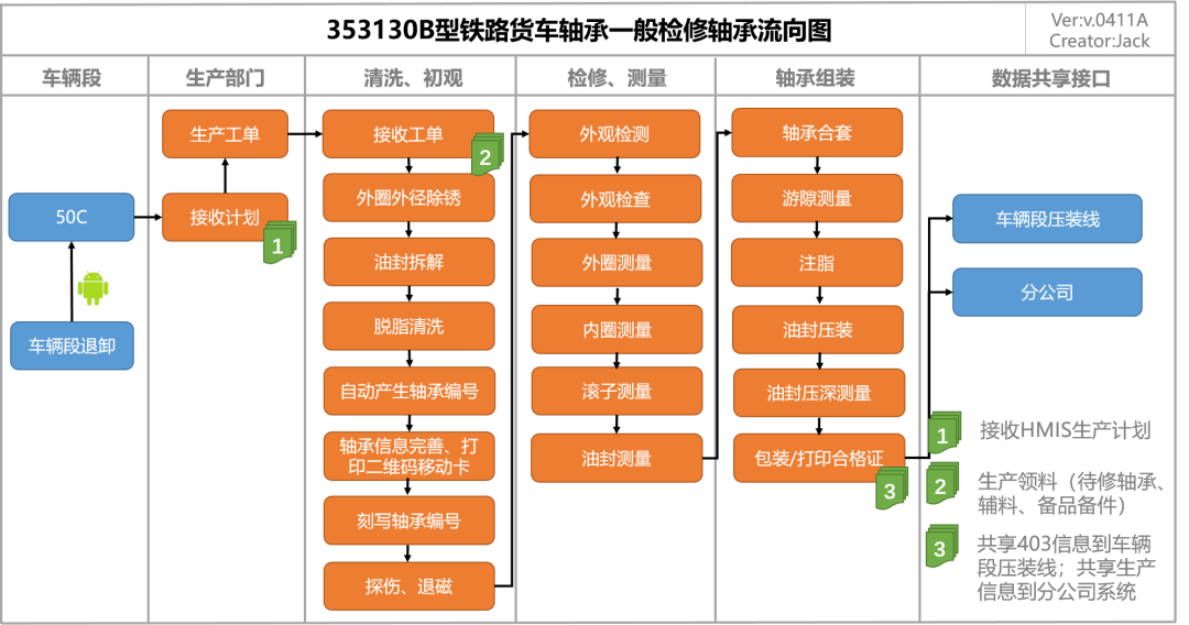 铁路货车滚动轴承检修MES生产执行系统通过对外圈磨修线、内圈磨修线、滚子磨修线、外圈测量线、内圈测量线、滚子测量、分选线、成品组装线及一般检修线进行标准化流程设定以及对工艺参数的设定,为标准化管控提供前提条件;MES系统通过串口/网口链接数控设备PLC系统,实现对数据的采集,对于不合规的数据MES系统实时的进行辨别和卡控,确保不良品及时下线;MES保存所有生产现场产生的数据,形成生产大数据为后期的质量追溯、质量统计分析等业务提供条件。