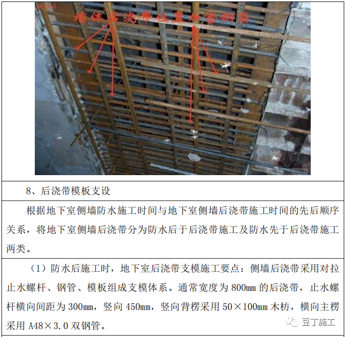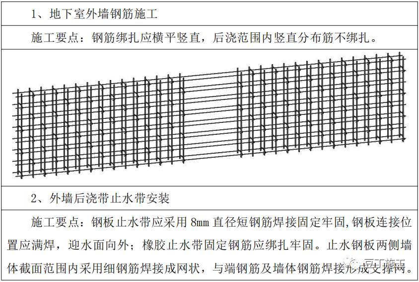 本工艺手册为后浇带施工工艺手册,共分三部分。主要包括:地下室底板后浇带、地下室侧墙后浇带、地下室顶板及地上楼板后浇带。