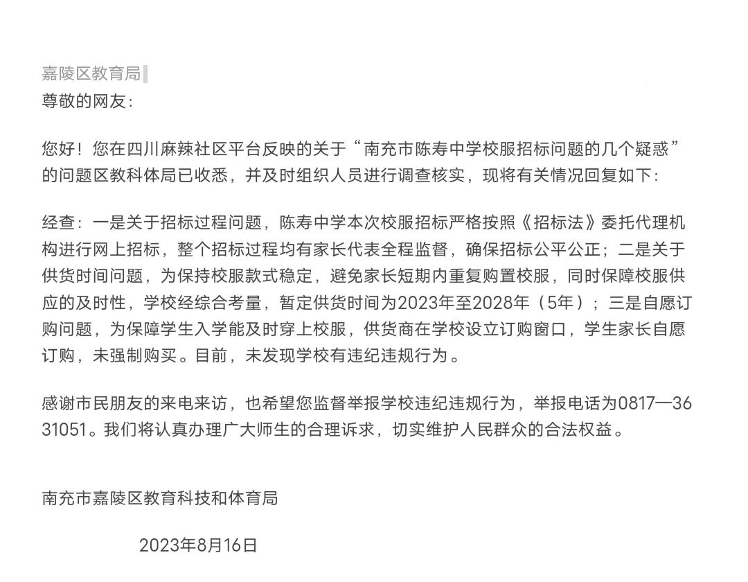 尊敬的网友:您好!您在四川麻辣社区平台反映的关于“南充市陈寿中学校服招标问题的几个疑惑”的问题区教科体局已收悉,并及时组织人员进行调查核实,现将有关情况回复如下:经查:一是关于招标过程问题,陈寿中学本次校服招标严格按照《招标法》委托代理机构进行网上招标,整个招标过程均有家长代表全程监督,确保招标公平公正;二是关于供货时间问题,为保持校服款式稳定,避免家长短期内重复购置校服,同时保障校服供应的及时性,学校经综合考量,暂定供货时间为2023年至2028年(5年);三是自愿订购问题,为保障学生入学能及时穿上校服,供货商在学校设立订购窗口,学生家长自愿订购,未强制购买。目前,未发现学校有违纪违规行为。感谢市民朋友的来电来访,也希望您监督举报学校违纪违规行为,举报电话为0817—3631051。我们将认真办理广大师生的合理诉求,切实维护人民群众的合法权益。 南充市嘉陵区教育科技和体育局 2023年8月16日