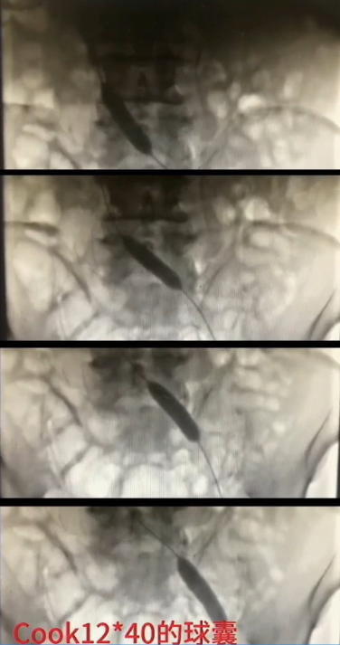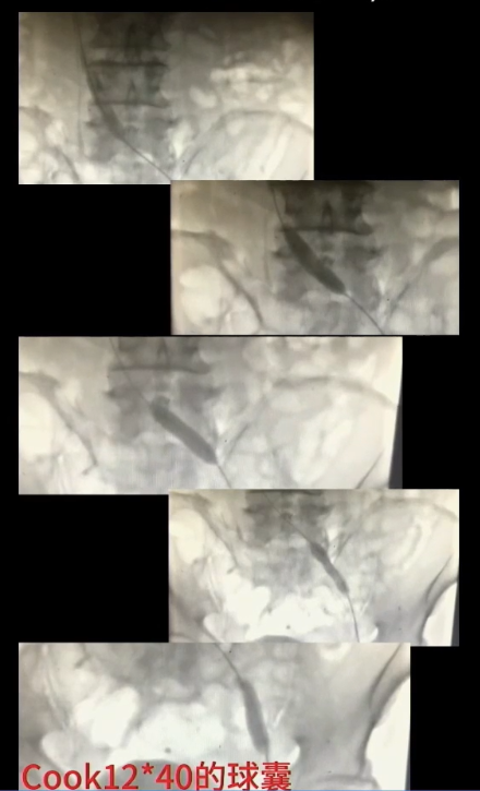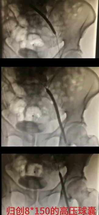 手术过程(四):退出抽吸导管后,复查造影,股浅静脉内血栓消失,但血流速度仍缓慢,提示近心端仍有梗阻。使用高压球囊扩张髂静脉,可见髂总静脉明显狭窄。分段扩张完成后,引入12 mm×40 mm球囊继续扩张。