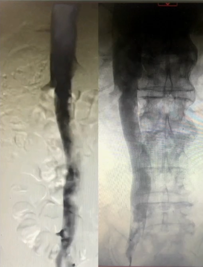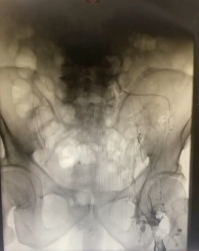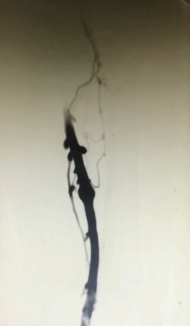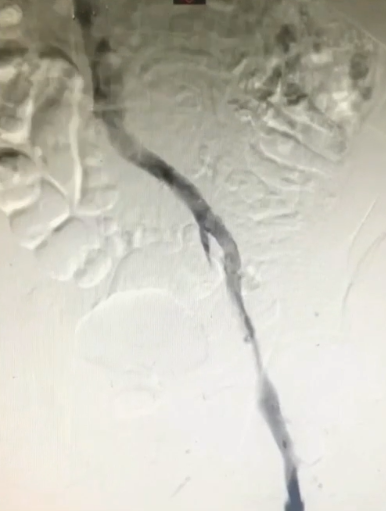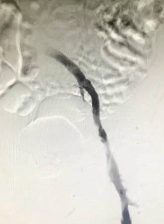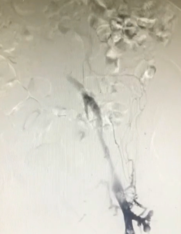手术过程(二):8F鞘穿刺左侧腘静脉,造影见股浅静脉内充盈缺损,血液回流速度慢,髂外静脉内大量充盈缺损,髂总静脉未见显影,周围侧支循环开放。