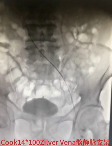 手术过程(五):复查造影见髂总静脉处仍狭窄,与家属沟通后,同意置入支架。引入髂静脉支架,定位准确后,谨慎释放,12 mm×40 mm球囊扩张髂静脉支架。