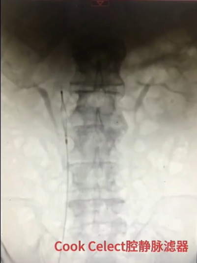 手术过程(一):局麻下,6F穿刺鞘穿刺右侧股静脉,造影见右肾静脉于第一腰椎下缘平面汇入腔静脉。换鞘后,引入腔静脉滤器,于第二腰椎上缘水平释放。