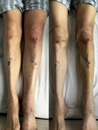 术后第一天,患者症状明显缓解,皮肤颜色恢复正常。对比术前,患者足踝部、小腿上段、大腿下段的腿围减少4~6 cm。