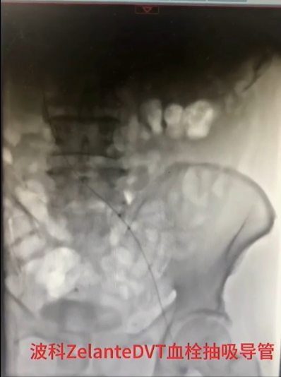 手术过程(三):导丝通过髂总静脉略有阻力,交换stiff导丝后,引入DVT血栓抽吸导管,连接AngioJet血栓抽吸装置,于髂股静脉处喷射配置好的20万IU尿激酶,20分钟后,再次引入导管,改为抽吸模式,在髂股静脉血栓内抽吸,部分团块较大的血栓往返抽吸数次。