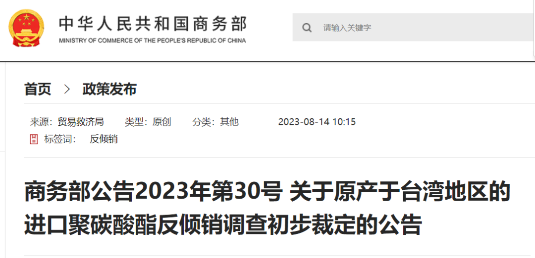 (1)调查范围:原产于台湾地区的进口聚碳酸酯。