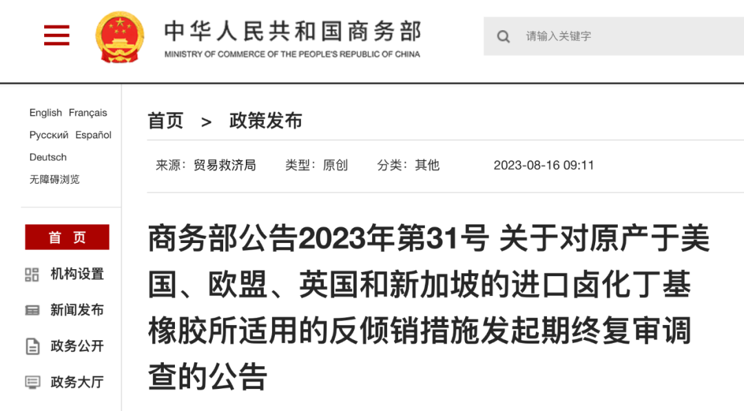 (6)事件回顾:此前在2018年8月10日,商务部发布2018年第40号公告,决定自2018年8月20日起对原产于美国、欧盟和新加坡的进口卤化丁基橡胶征收反倾销税。反倾销税率分别为美国75.5%,欧盟27.4%—71.9%,新加坡23.1%—45.2%,实施期限5年。