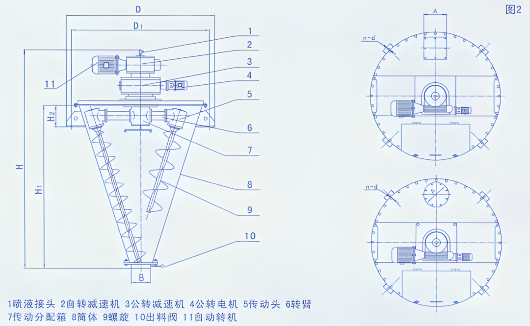 其传动部分一般由自转电机、公转电机、蜗杆、摆线针轮减速机、齿轮等组成,能够实现螺旋部件的公转和自转运动。其螺旋组件一般为两只非对称排列的悬臂螺旋机构组成,通过其快速自转将物料向上提升,且转臂带动其公转,使物料进入螺柱包络线内,部分被错位提升,部分被抛出螺柱,从而全方位物料的更新扩散,该设备能够有效确保物料在较大范围内翻动,并实现均匀混合。