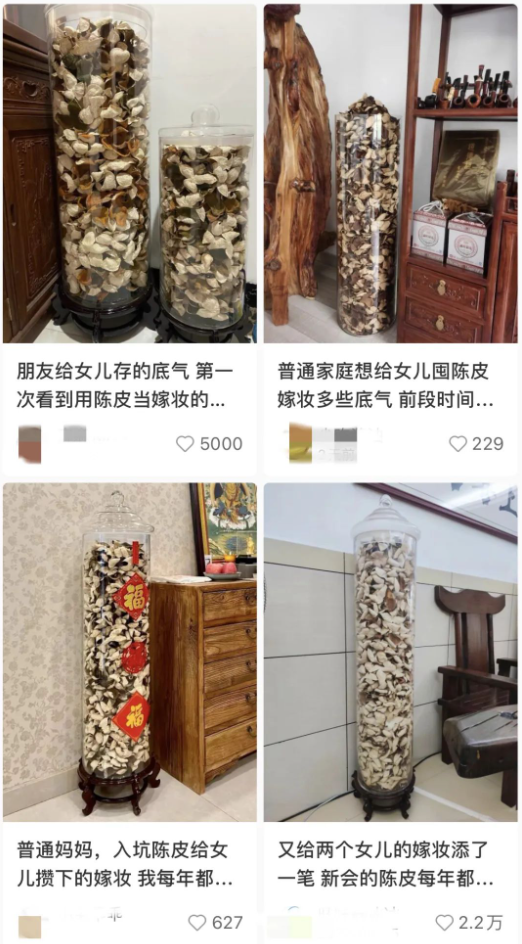 广东家庭甚至还会专门为女儿存新会陈皮作为嫁妆,存得越多年份越久,就越有排面。