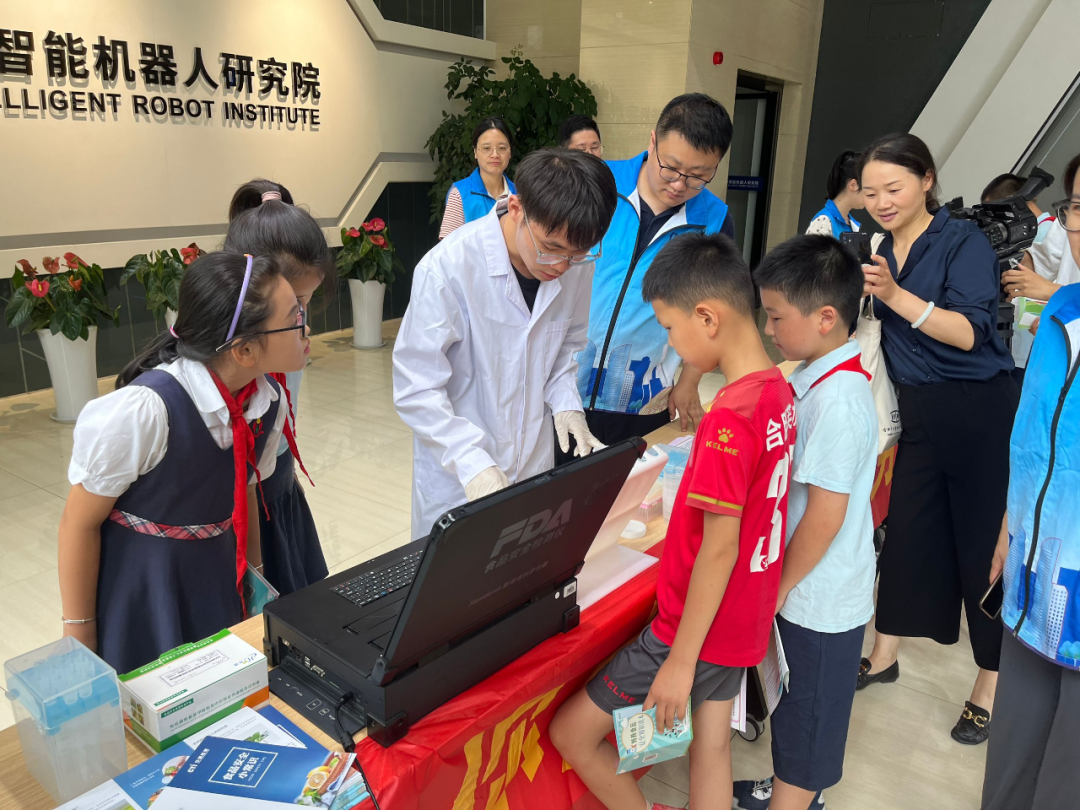 近日,在哈工大机器人(合肥)科普研学基地,家长们带着小朋友感受科技创新的神奇魅力。基地入口处的桌子上摆放着两套食品安全快速检测设备,几名工作人员严阵以待,合肥市市场监管局“你点我检”和“你送我检”活动正式走进研学教育基地。