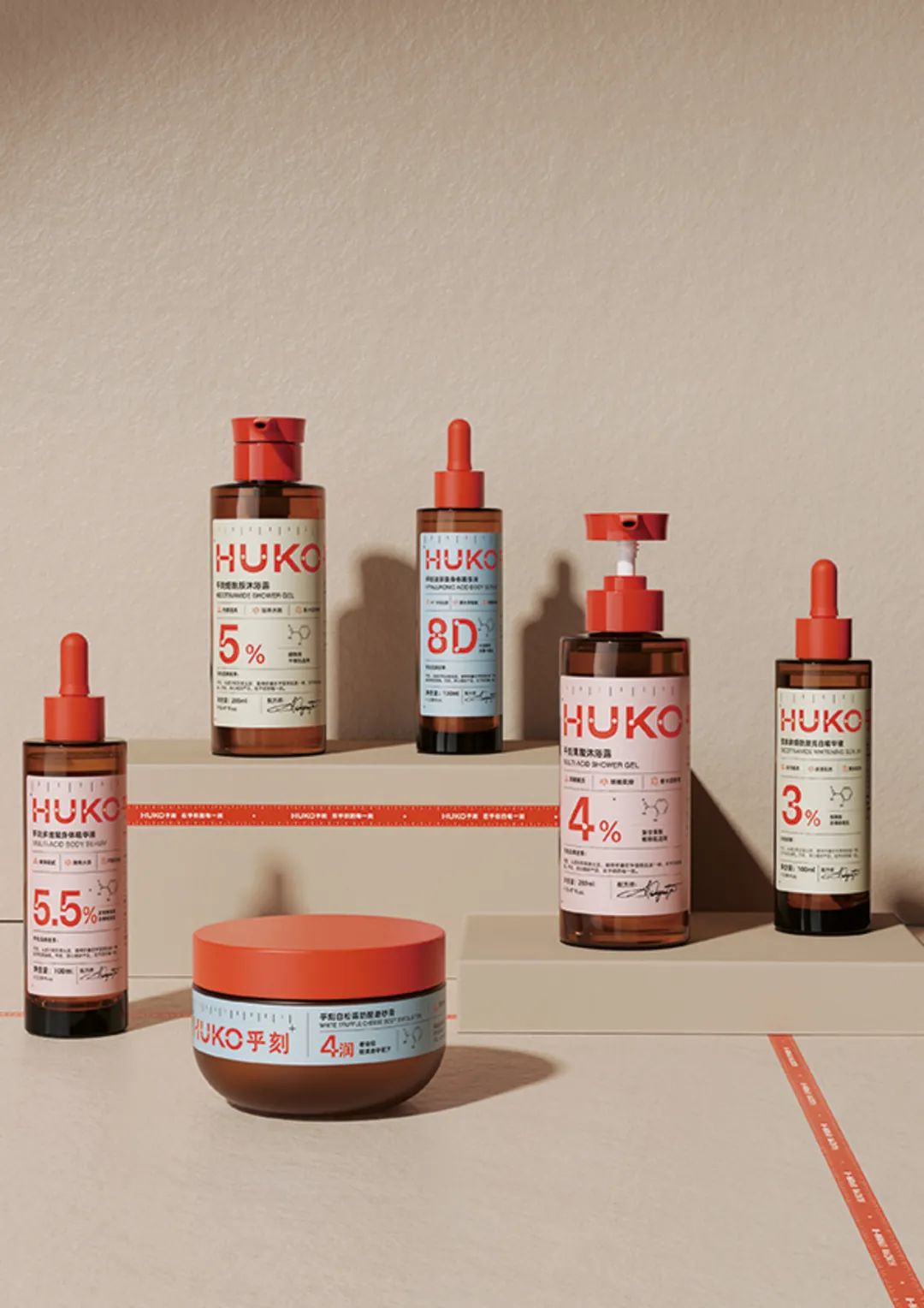 受卡尺的启发,HUKO个人护理系列的包装被赋予了技术外观,使身体护理产品的科学发展变得切实可见。文字上方的测量刻度和标签结构的直线是中心元素。评审团称赞了吸引人的简约配色方案,以及“包装通过其简单性传达了透明和诚实,同时又因其细节引发了好奇心”这一事实。所有关于成分和效果的重要信息都清楚简明地显示在标签上,标签可以根据需要进行缩放。
