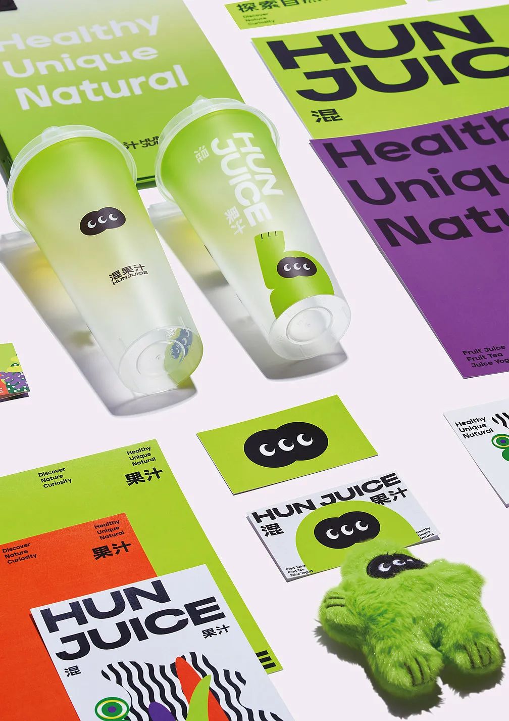果汁品牌HUNJUICE的前三个字母来自“健康”、“独特”和“天然”这三个词。包装设计的目的是以杯子的形式体现这些特征。评审团认为,彩色图形的俏皮精神会立即让人心情愉快。说明性的外观始终如一地应用于外带杯。异想天开的人物,用平淡的笔触赋予生命,可以在地表的幻想世界中找到。评审团说:“将果汁描绘成人类与自然之间的联系的想法是以一种抽象、有趣的方式实现的。”