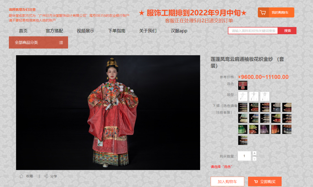 据汉服圈子消息称:广州原创定制汉服生产商明华堂的一件“莲蓬凤鸾”汉服售价7800元,整套汉服买下来要9600元。