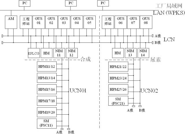 CENTUM CS系统是日本横河公司的产品,化肥二部采用其CS1000系统。CS系统主要由工程师站EWS,信息指令站ICS,双重化现场控制站AFM20D,通信门单元ACG,双重化通讯网络V-NET等构成。通讯网络(VL net):185m同轴电缆(或20km光纤电缆), 数据传输速率为10Mbps.