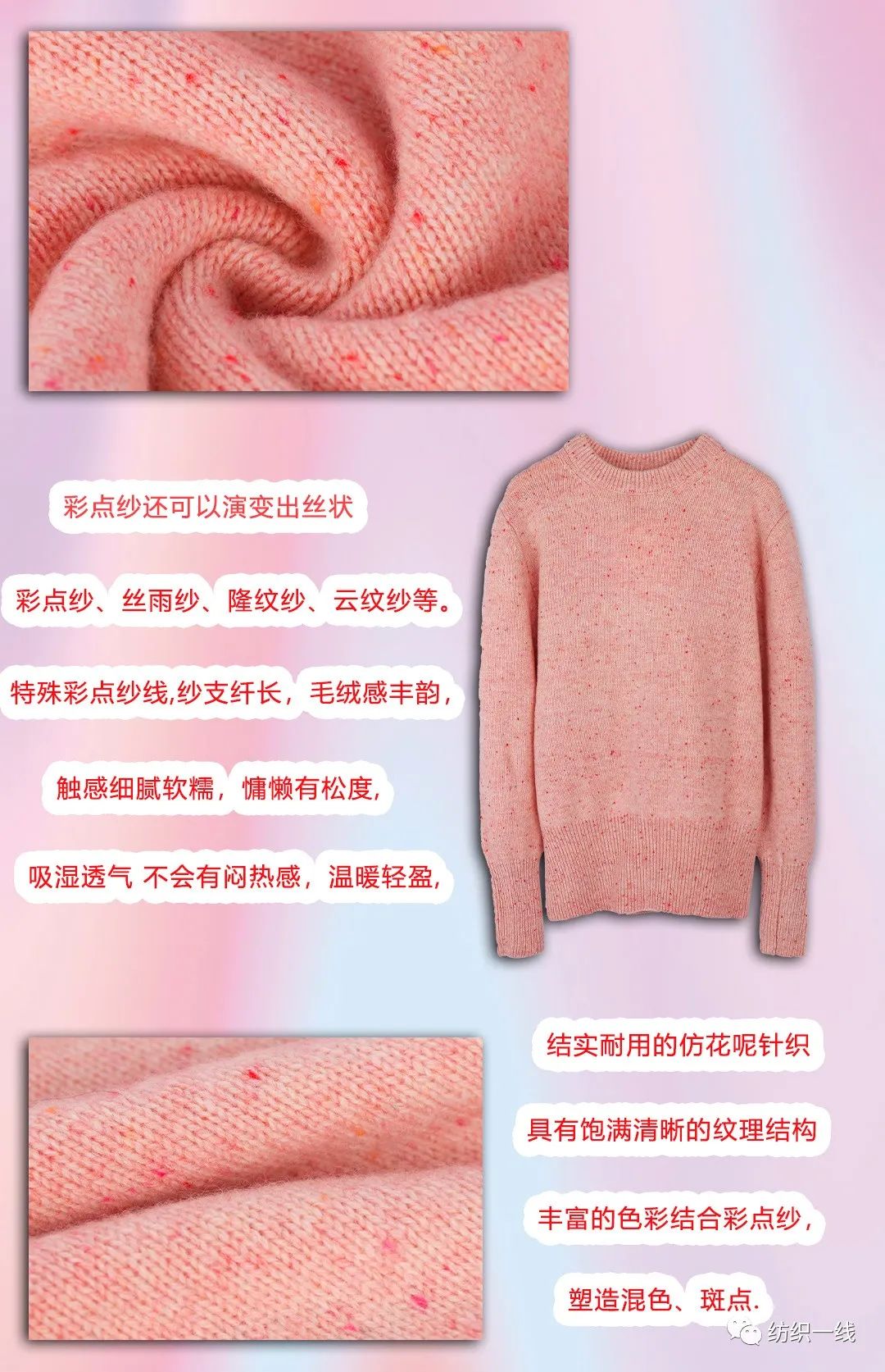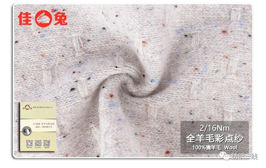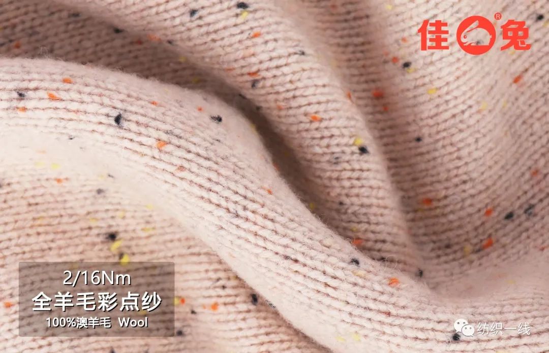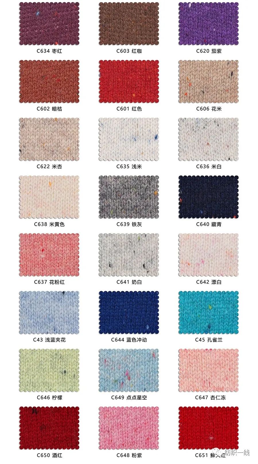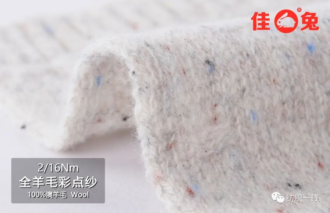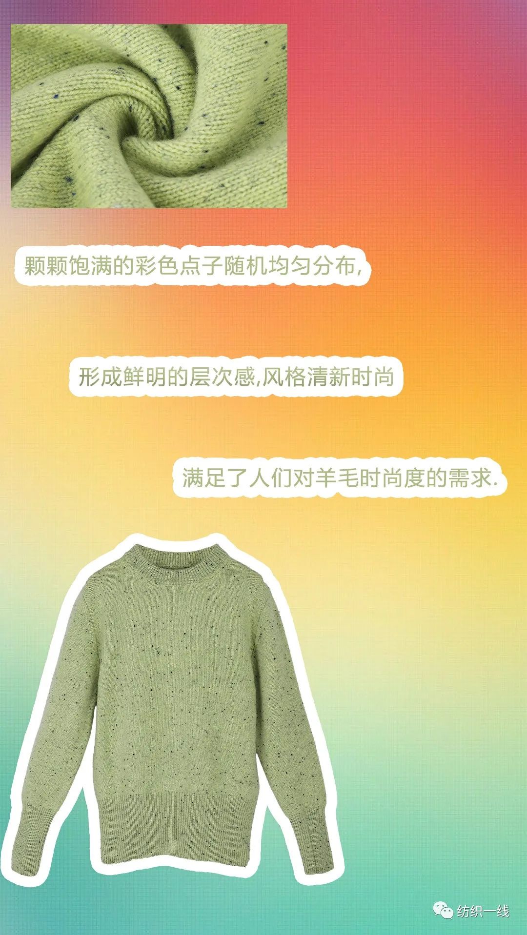 彩点纱是在原白纱或色纱上放进一种或几种彩色点子的纱线,用彩点纱制成的织物,其多元的色彩与点纱搭配,错落有致,明艳活泼。颗颗饱满的彩色点子随机均匀分布,形成鲜明的层次感,风格清新时尚,满足了人们对羊毛时尚度的需求.