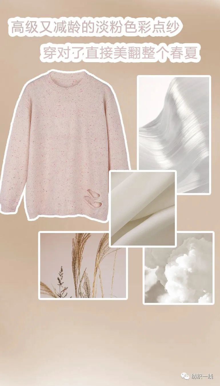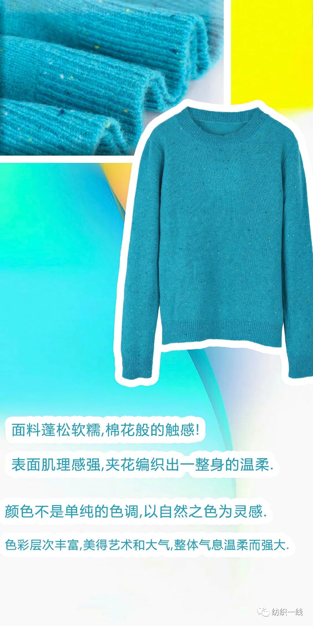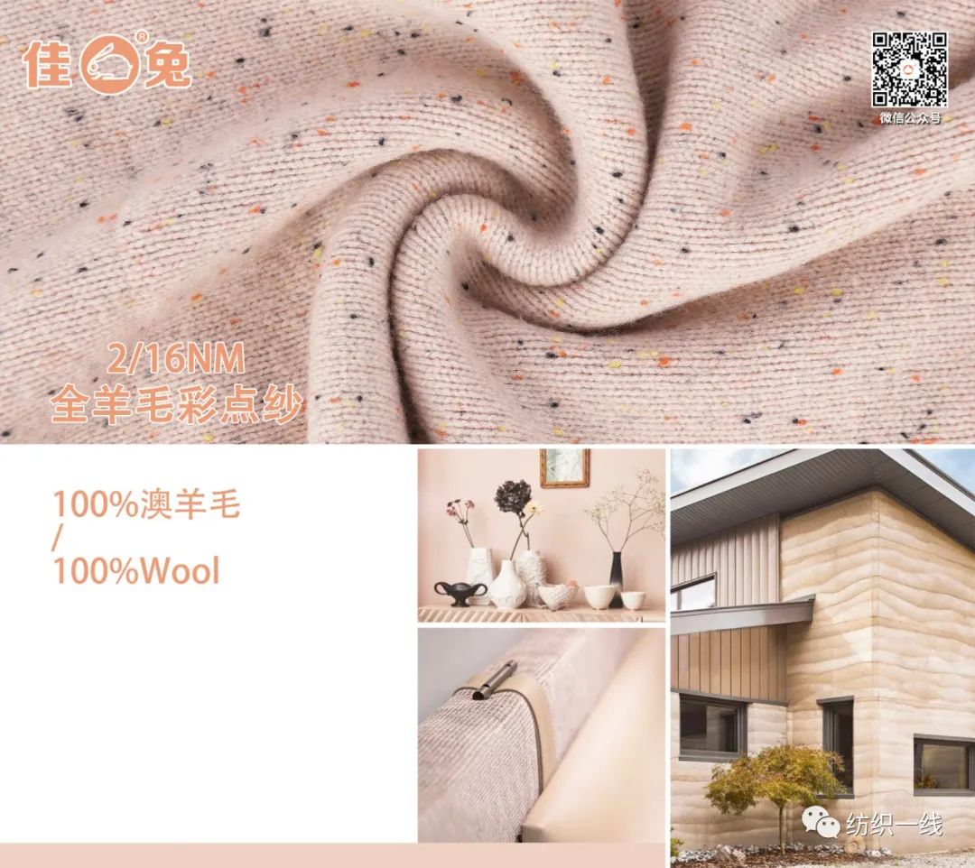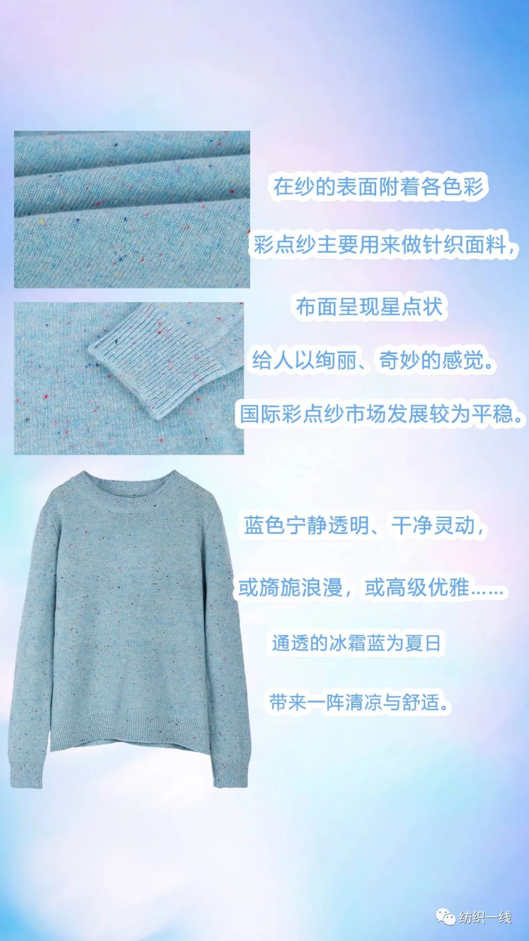 彩点纱是在原白纱或色纱上放进一种或几种彩色点子的纱线,用彩点纱制成的织物,其多元的色彩与点纱搭配,错落有致,明艳活泼。颗颗饱满的彩色点子随机均匀分布,形成鲜明的层次感,风格清新时尚,满足了人们对羊毛时尚度的需求.
