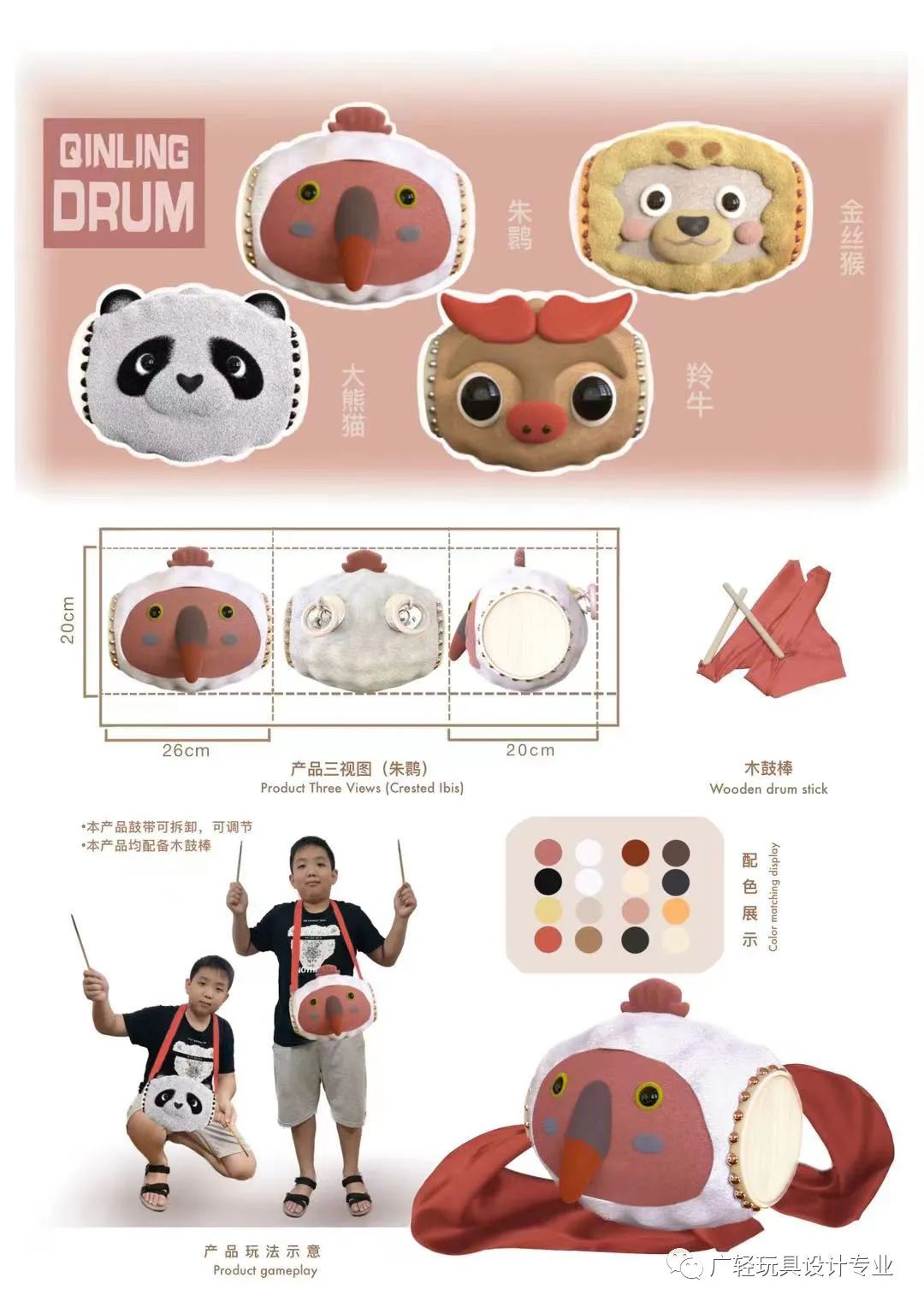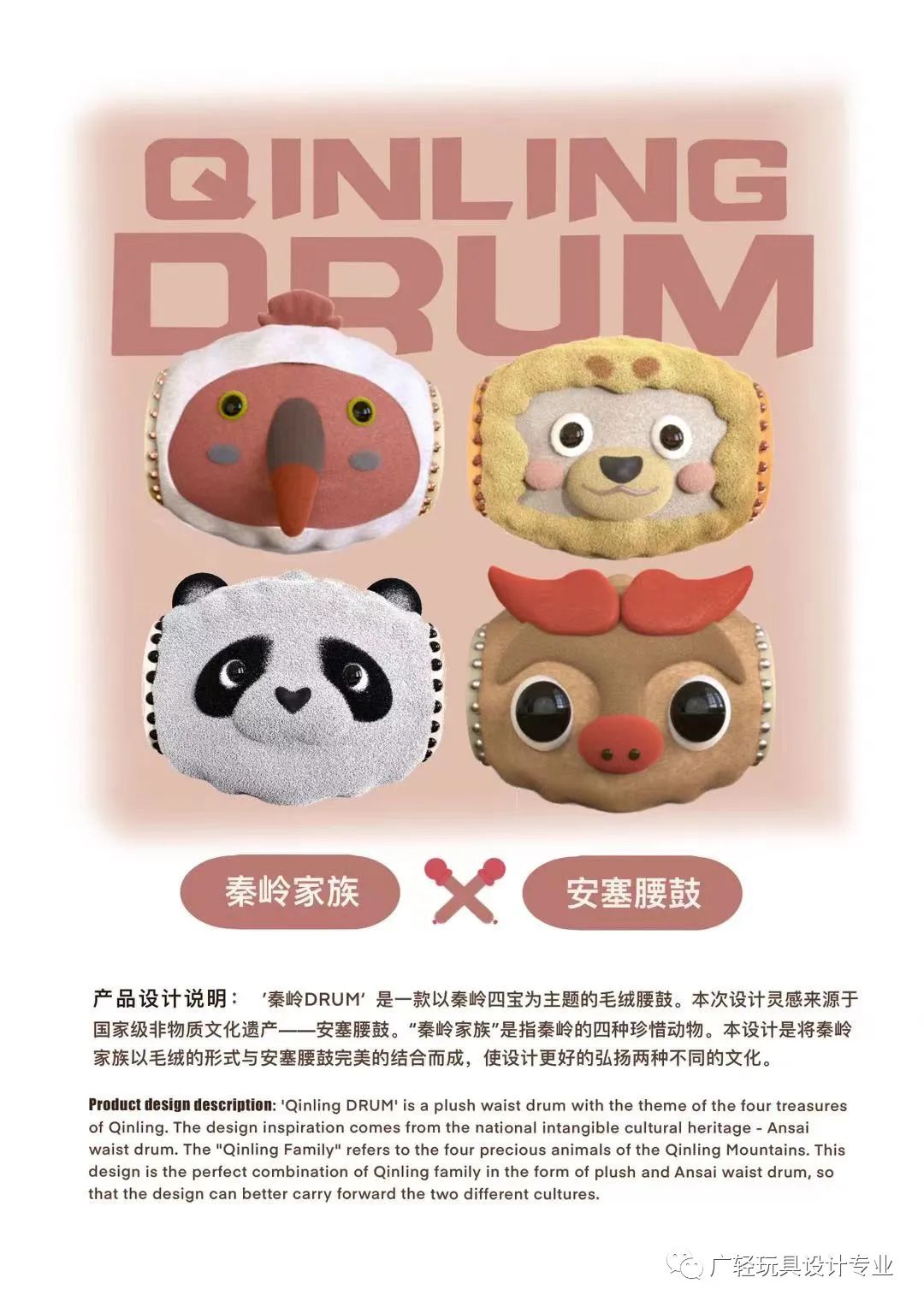 秦岭DRUM”是一款以秦岭四宝为主题的毛绒腰鼓。本次设计灵感来源于国家级非物质文化遗产安塞腰鼓。“秦岭家族”是指秦岭的四种珍惜动物。本设计是将秦岭家族以毛绒的形式与安塞腰鼓完美的结合而成,使设计更好的弘扬两种不同的文化。该产品配备木鼓棒与鼓带,鼓带可自由调节长度。该产品玩具可玩性高,互动性强,纪念意义强大,更好的传承与展示安康文化。而且作为纪念品或者旅游产物具有一定的辨识度,具有较强的市场价值。