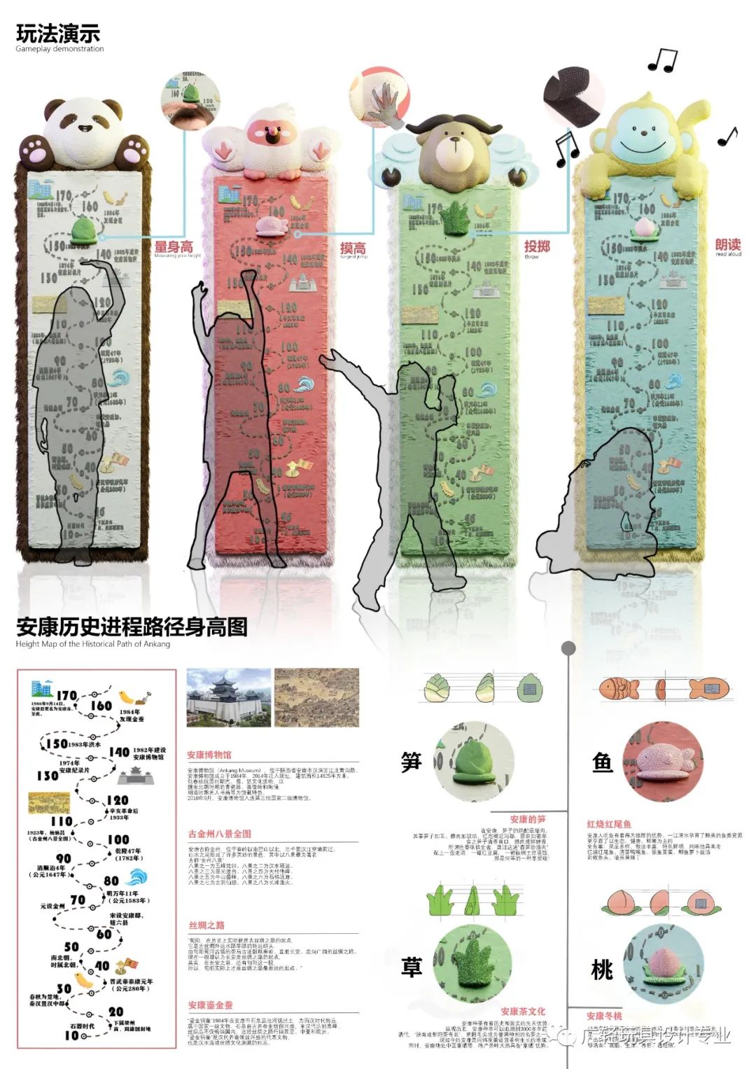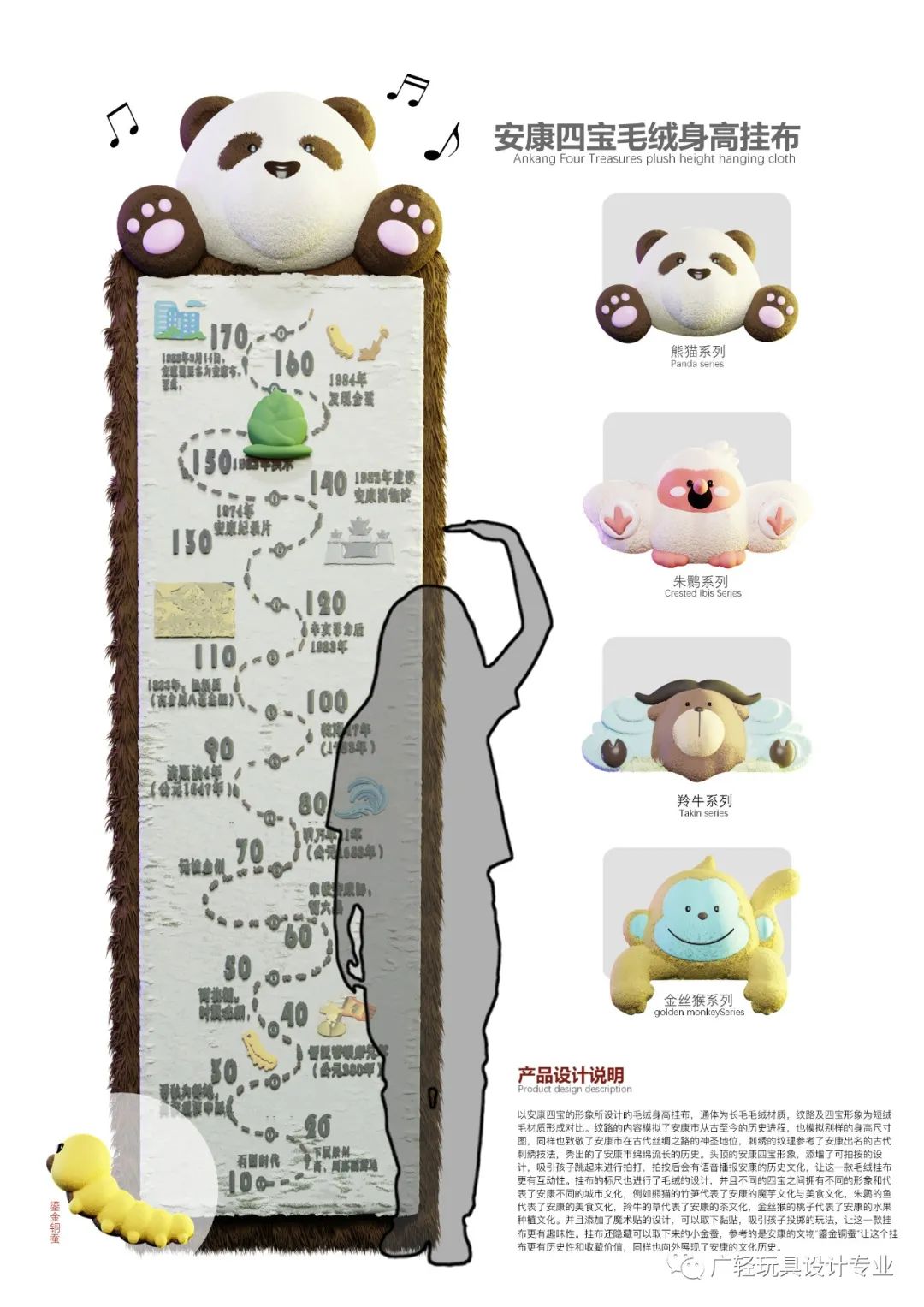 头顶的安康四宝形象,添增了可拍按的设计,吸引孩子跳起来进行拍打,拍按后会有语音播报安康的历史文化,让这一款毛绒挂布更有互动性。挂布的标尺也进行了毛绒的设计,并且不同的四宝之间拥有不同的形象和代表了安康不同的城市文化,例如熊猫的竹笋代表了安康的魔芋文化与美食文化,朱鹮的鱼代表了安康的美食文化,羚牛的草代表了安康的茶文化,金丝猴的桃子代表了安康的水果种植文化。并且添加了魔术贴的设计,可以取下黏贴,吸引孩子投掷的玩法,让这一款挂布更有趣味性。