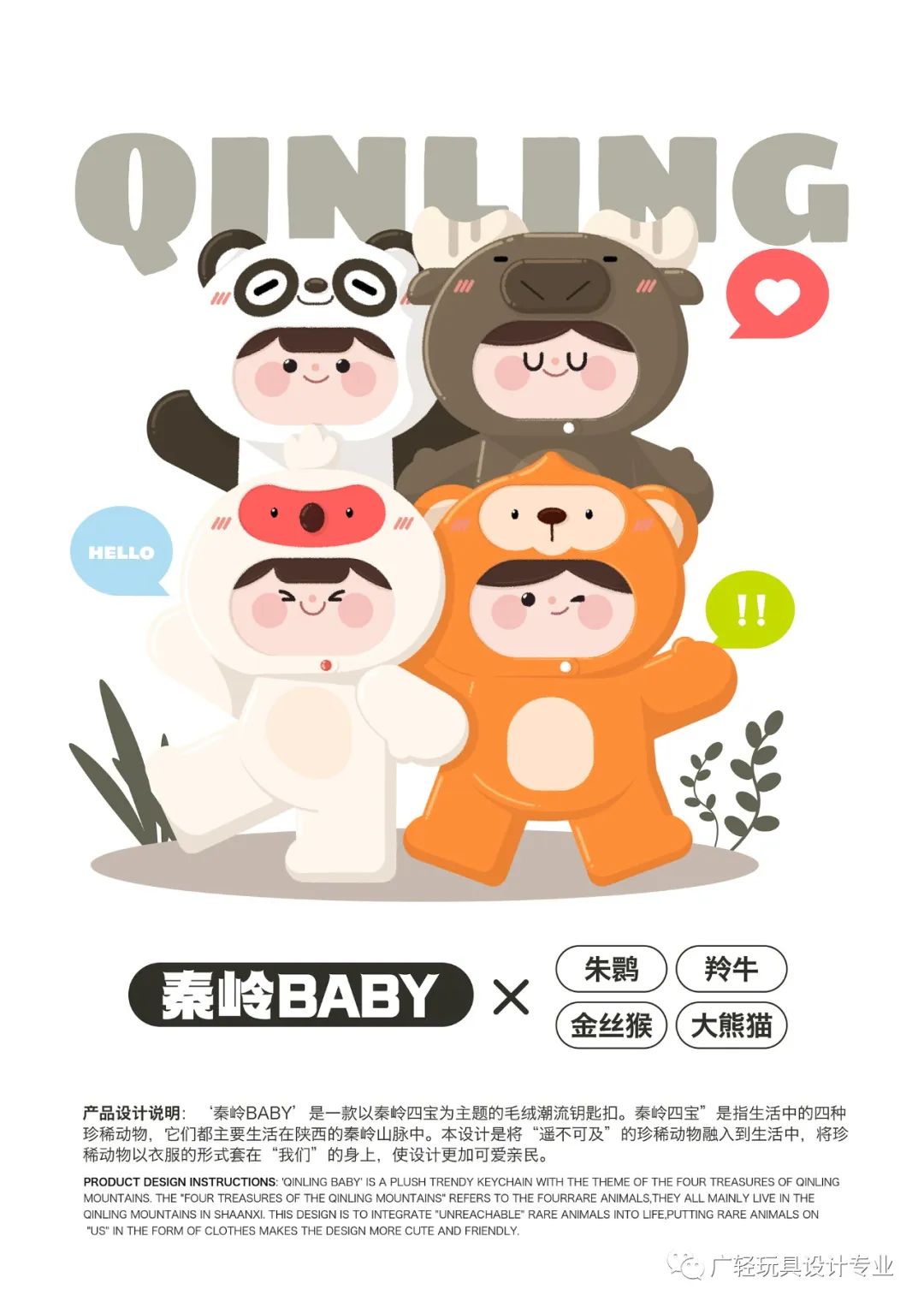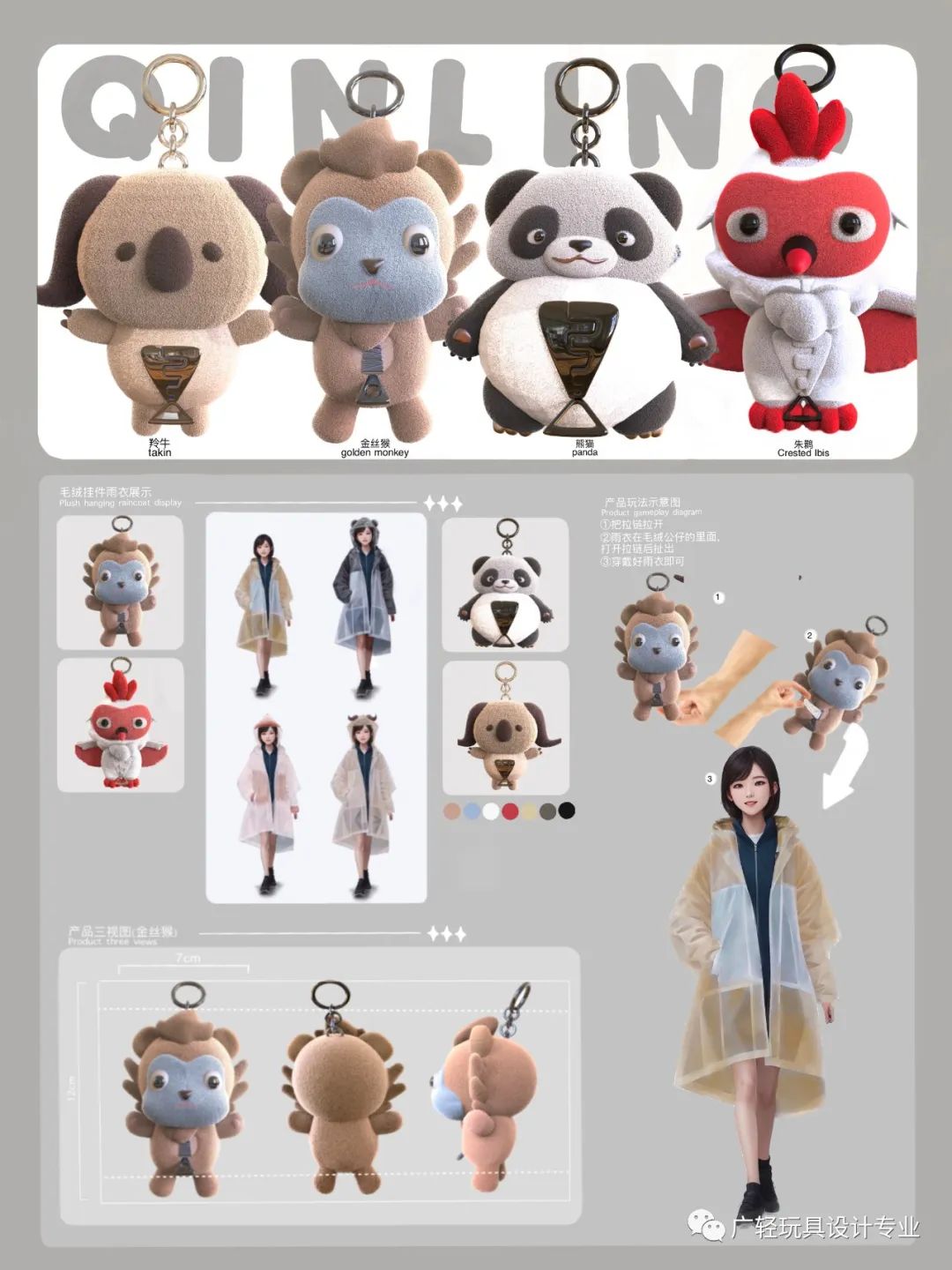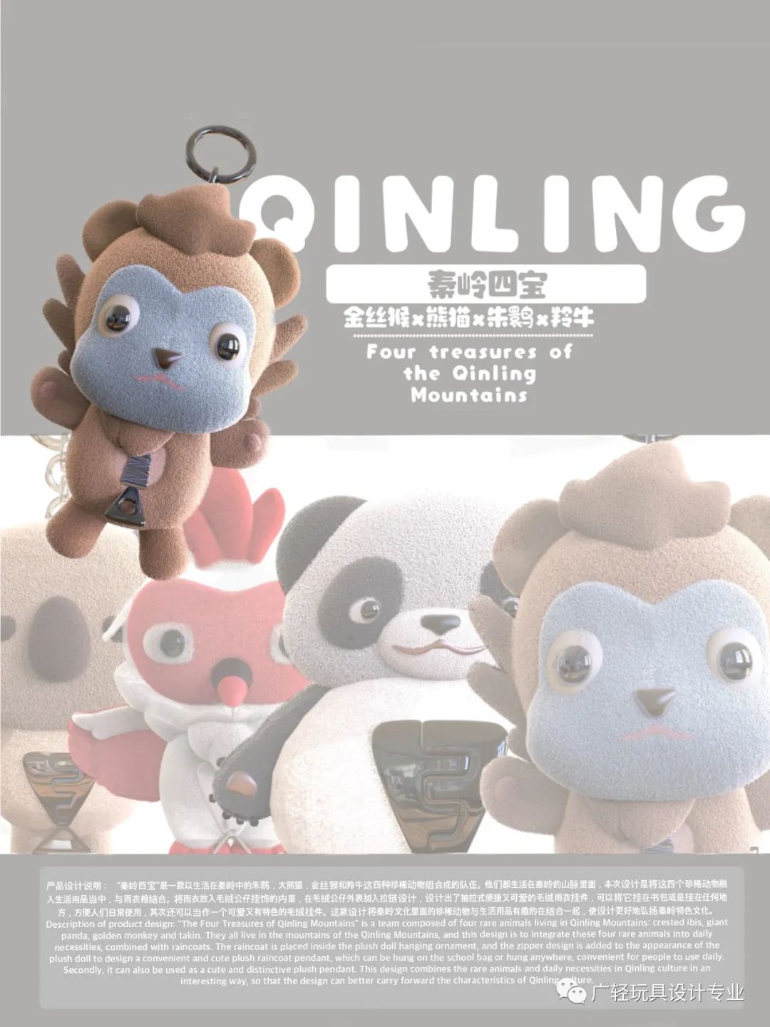 "秦岭四宝"是一款以生活在秦岭中的朱鹦,大熊猫,金丝猴和羚牛这四种珍稀动物组合成的队伍。他们都生活在秦岭的山脉里面,本次设计是将这四个珍稀动物融入生活用品当中,与雨衣相结合。将雨衣放入毛绒公仔挂饰的内里,在毛绒公仔外表加入拉链设计,术计出了抽拉式便捷又可爱的毛绒雨衣挂件,可以将它挂在书包或是挂在任何地方,方便人们日常使用,其次还可以当作一个可爱又有特色的毛绒挂件。这款设计将秦岭文化里面的珍稀动物与生活用品有趣的在结合一起,使设计更好地弘扬秦岭特色文化。
