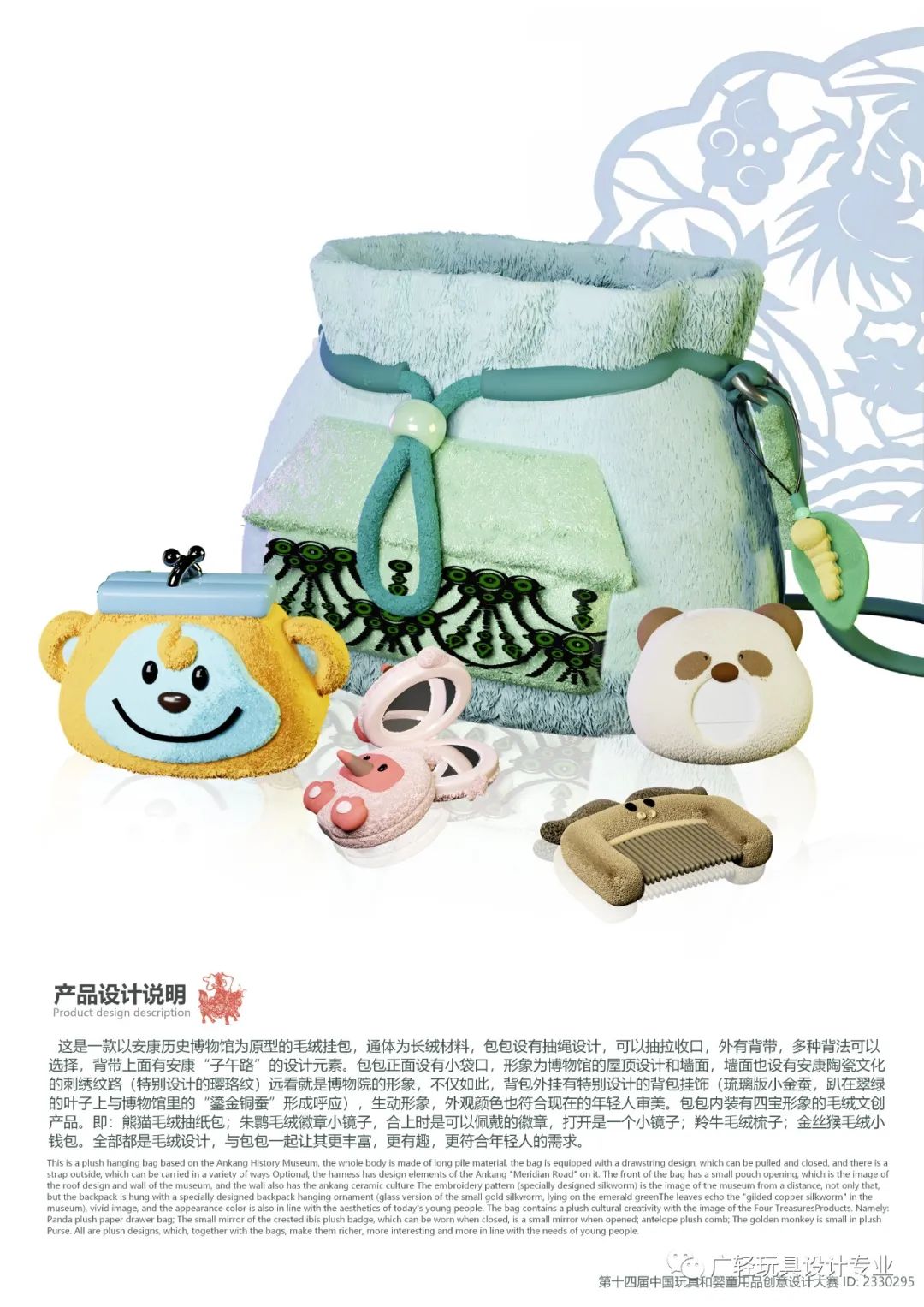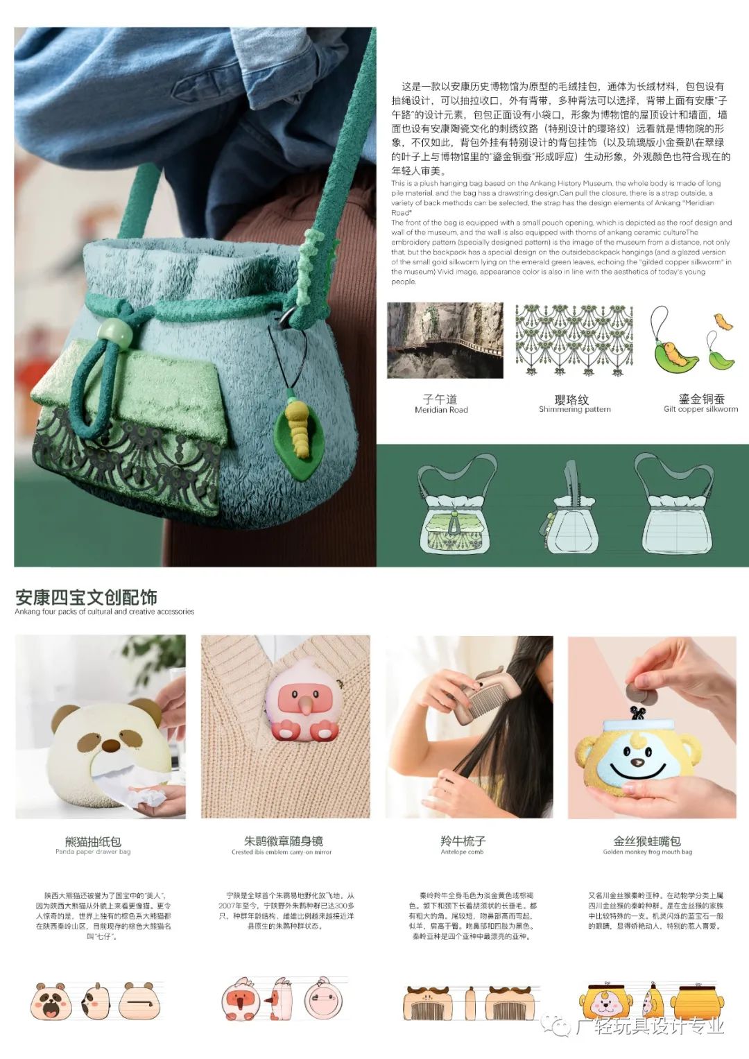 此次课程设计以安康市历史文化作为设计主题,突出地方人文历史的特点,将新元素融入到毛绒设计领域。以文创、电子、潮玩形式创新毛绒设计,提升了毛绒设计的功能性与交互性,探索毛绒产品市场新功能区域。文创毛绒将人文历史与功能相结合,大大提升旅游纪念产品实用性,能吸引更多的消费用户。