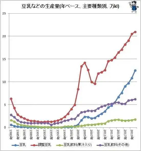 1983-2019年,日本各种类豆乳年产量统计。图源:Foodaily每日食品END