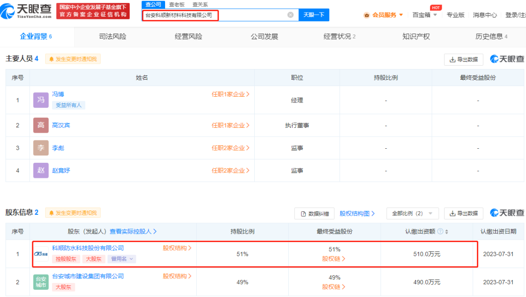 建融集团和台安城建集团都是主营房地产开发、建筑工程施工、城市建设的地方国企,对防水产品都有着大量的需求。科顺股份是一家民营防水企业、上市公司,成立于1996年,位列全球建筑材料上市公司百强,2022年科顺股份实现营业收入约77.73亿元,近期的小目标是营收突破100亿。刚刚揭牌的台安科顺,注册于2023年8月4日,注册资本1000万元,科顺是控股股东,出资510万元,持股51%,台安城建集团出资490万元,持股49%。台安科顺的法人和总经理是冯博,公司经营范围包括防水卷材、防水涂料、涂料、光伏组件、建设工程施工,建筑劳务分包等。